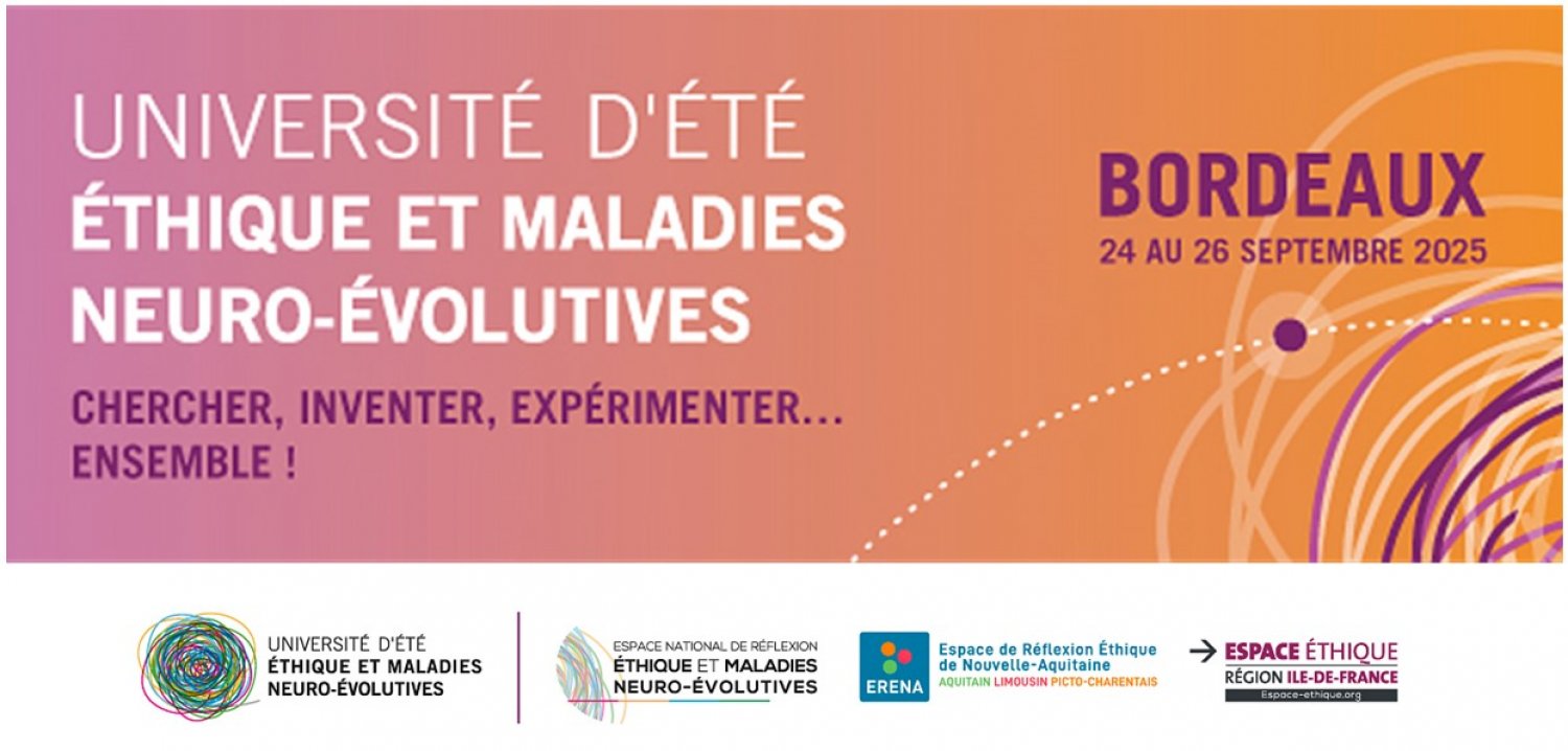 Chercher, inventer, expérimenter... ensemble ! L'Espace national de réflexion éthique sur les maladies neuro-évolutives, en partenariat avec l'Espace de réflexion éthique de Nouvelle Aquitaine, a organisé sa 14ème Université d'été les 24, 25 et 26 septembre derniers à Bordeaux. Trois journées intenses, trois belles journées où se sont mobilisés les acteurs locaux (CHU de Bordeaux, Université de Bordeaux, Institut des Maladies Neurodégénératives, Maison du cerveau notamment) et régionaux des pôles d'excellence en recherche sur les maladies neuro-évolutives, médecins, chercheurs, patients partenaires, membres d'associations, personnes concernées... La captation vidéo de ces trois jours sera mise en ligne prochainement. Nous vous en tiendrons informés ! En savoir +